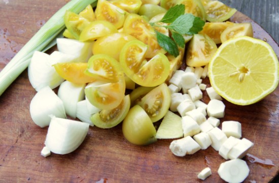 - Clean, rinse and cut all the ingredients for the soup base into fairly large chunks and put them into a saucepan, cover the veggies water.